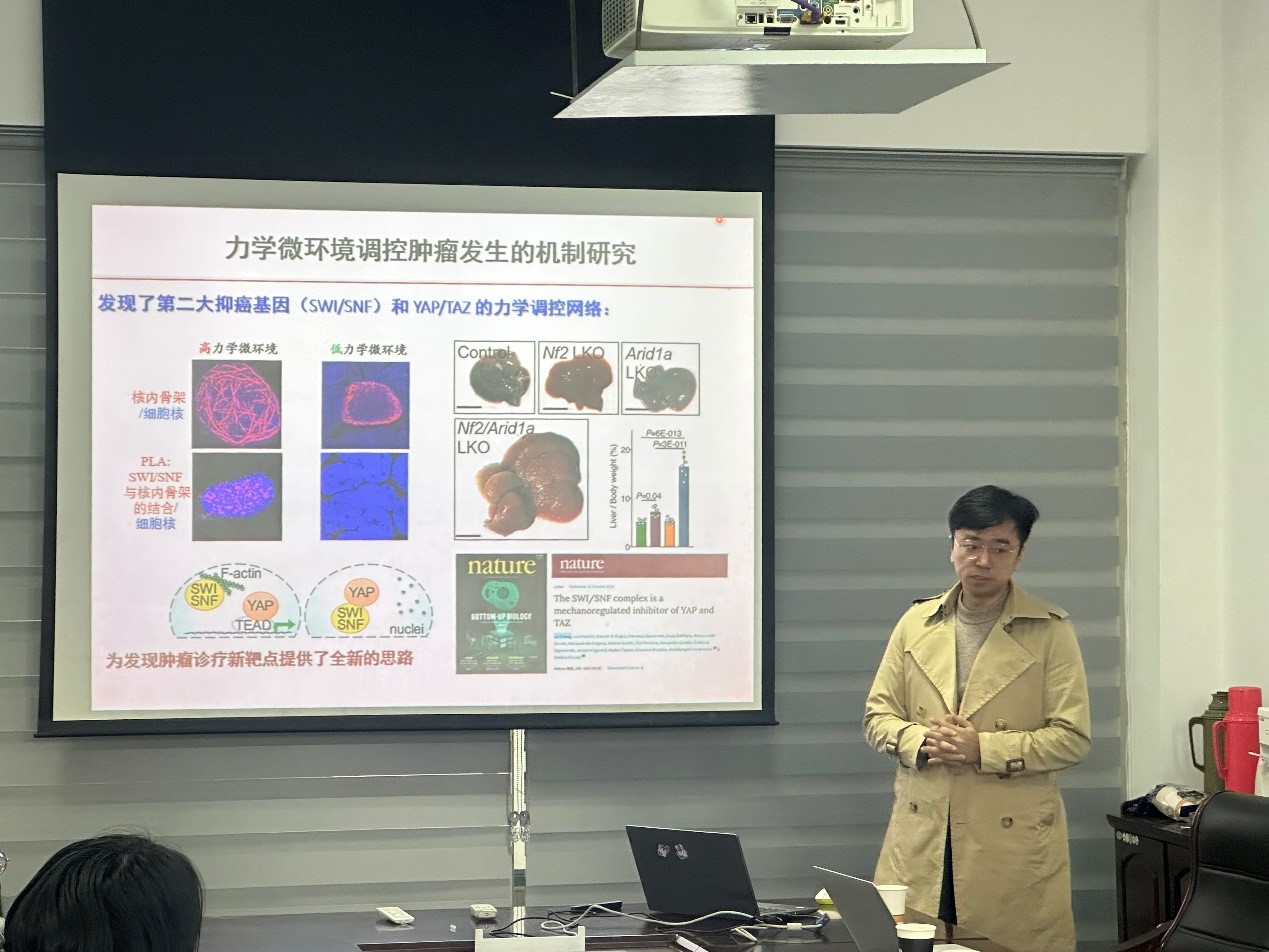 首先,崔教授做了题为“有机光伏材料的分子设计及聚集态行为调控”报告,通过高效有机光伏材料的烷硫基侧链工程、三元共混策略优化活性层形貌等,系统展示了有机光电材料的分子设计、合成与性能研究工作。畅教授“辐射和生物力学”的报告,从力学环境对生命影响的探索入手,结合放射生物学和生物力学,介绍了肿瘤增殖和侵袭转移中的关键基因,并提出了新型治疗方法,引起大家的极大兴趣。