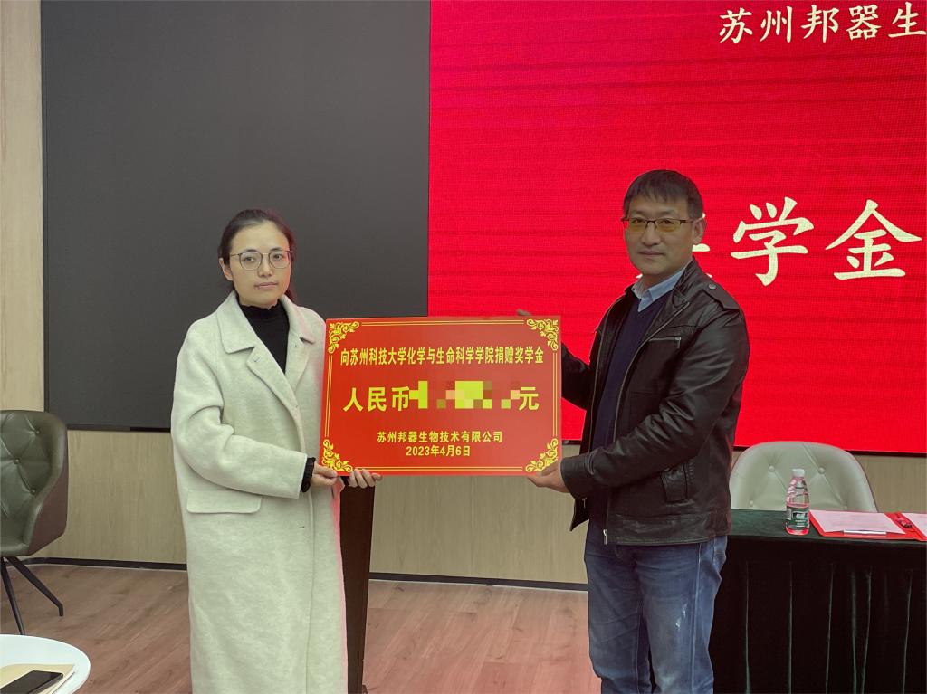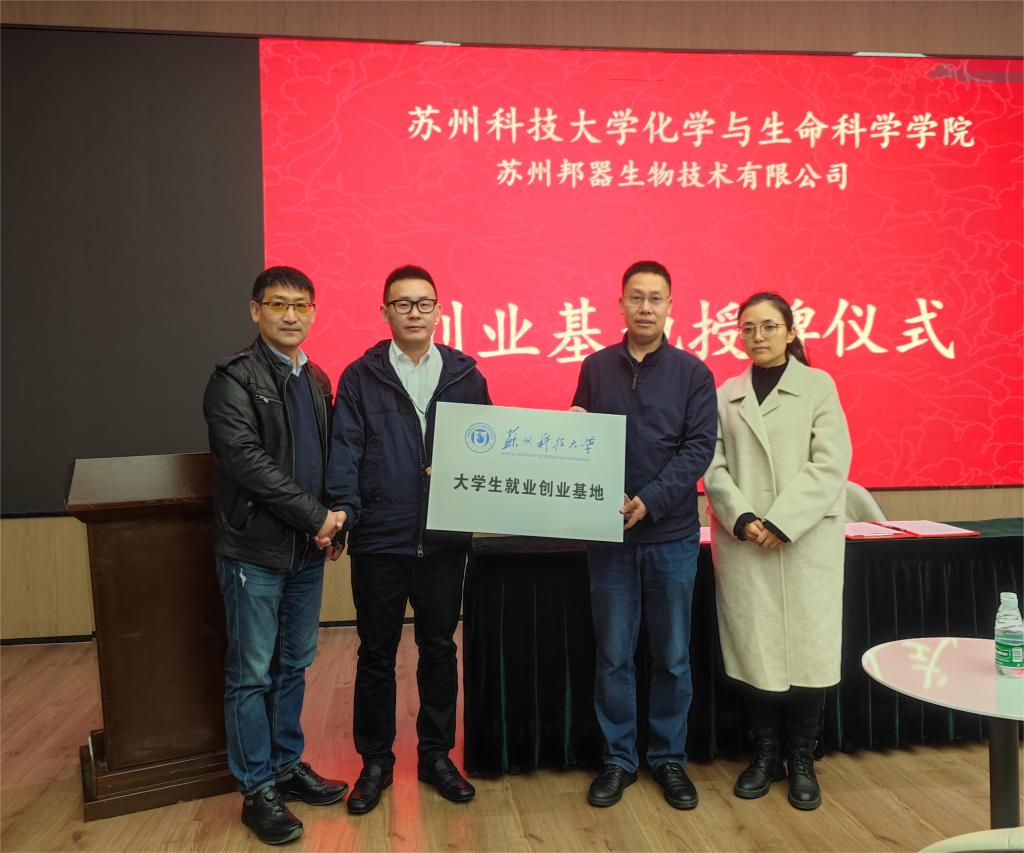 李良智、苗雪强与企业代表共同为苏州科技大学大学生就业创业基地揭牌。邦器生物技术有限公司与新球体育