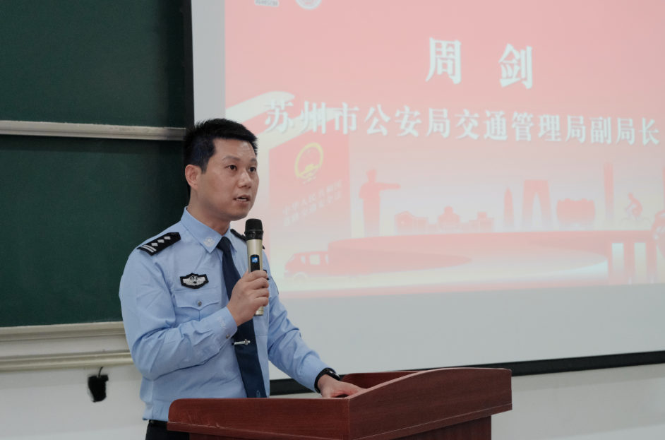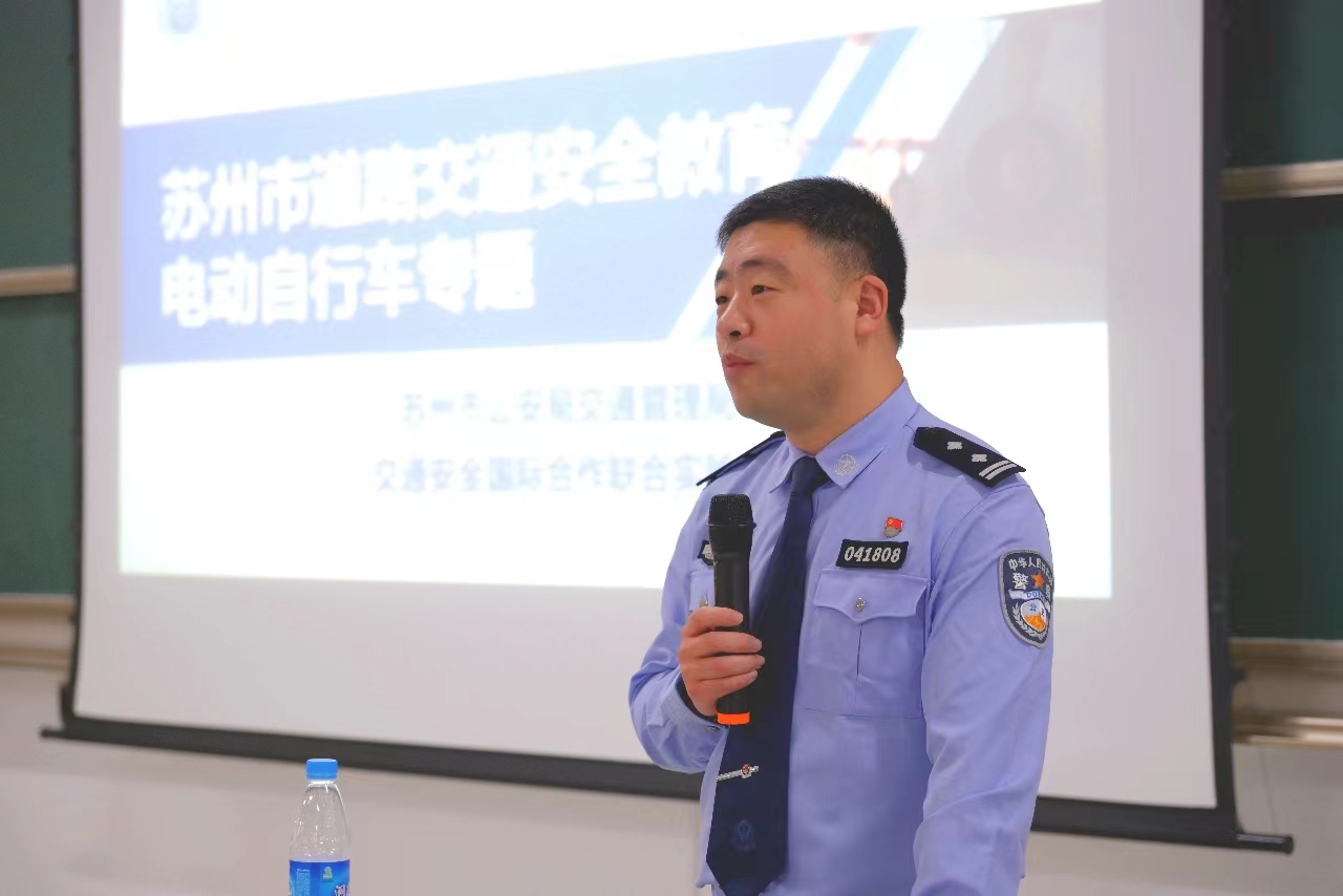宣讲现场,交通管理局交通事故对策大队副大队长王超和新区大队横塘中队张开仁警官围绕苏州市道路安全教育,以正确使用电动自行车为专题展开授课。同时,结合近期某高校电动自行车事故案例,深入分析事故发生的原因,进一步强调了正确佩戴头盔、杜绝违规载人的重要性。