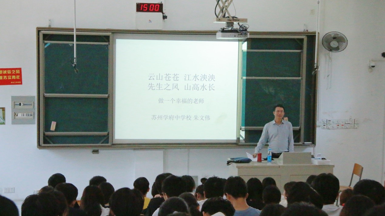 邀请苏州学府中学校校长、教学名师朱文伟为生物(科学)师范和化学师范专业学生开展了一场专题讲座,主题为“做一个幸福的老师”。新球
