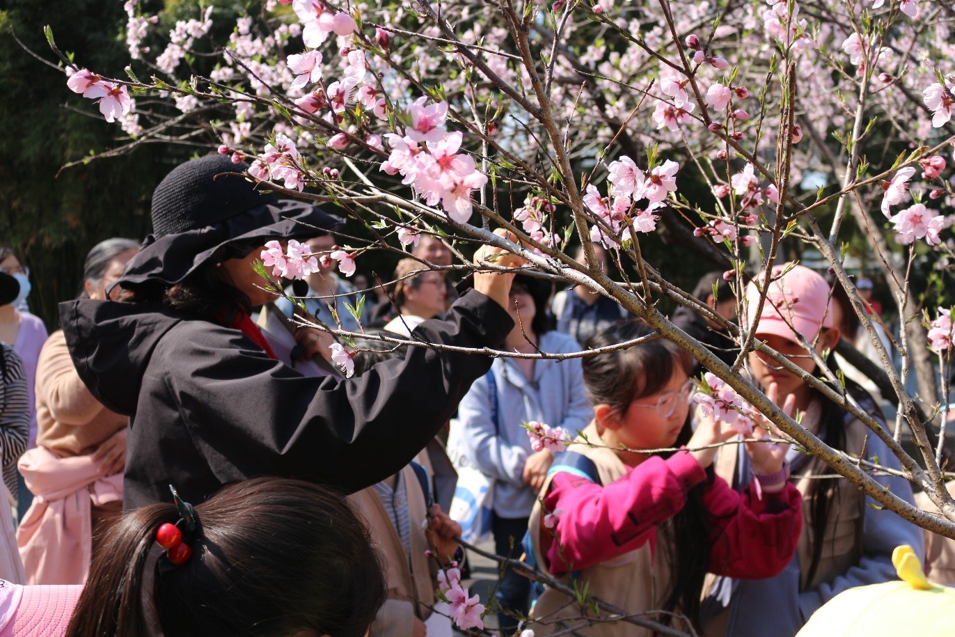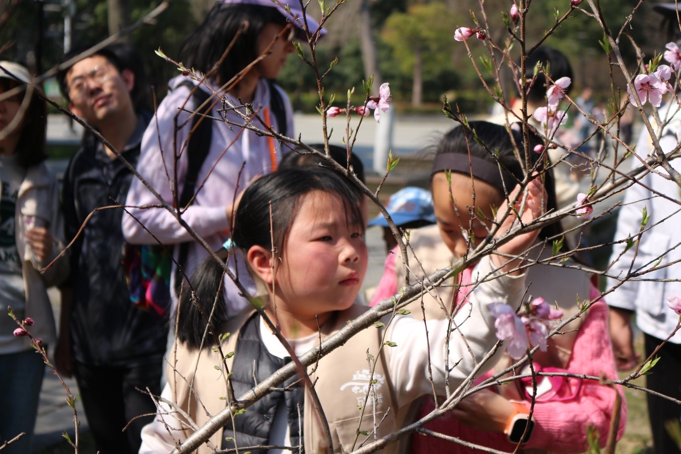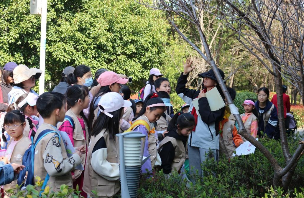 在专业导师“仙姑”和生物科学师范专业学生志愿者的带领下,亲子家庭漫步石湖步道,近距离观察春分时节争奇斗艳的桃、李、梨、海棠、樱花等蔷薇科植物的生态特征。孩子们通过观察花瓣纹理,用任务单记录花萼形态,亲手触摸贴梗海棠的短梗与垂丝海棠的柔枝,在实践中理解“完全花”“单瓣与重瓣”“花萼反折”等科学概念。一位家长感慨:“诗词中的‘红瘦’与孩子们说的‘落英缤纷’是如此的具象!”志愿者以苏轼《海棠》、李清照《如梦令》等名篇为引,结合花卉实景解析“绿肥红瘦”“故烧高烛”的文学意象。