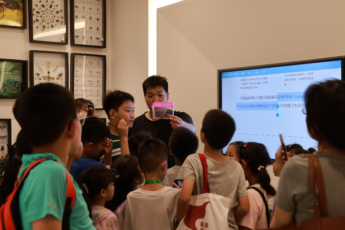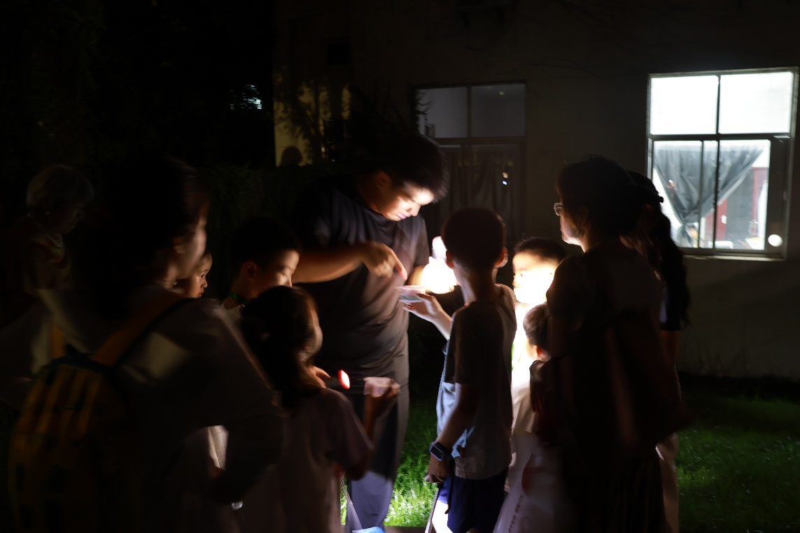 下午,通过“科普苏州”推荐和线上抢报的26组亲子家庭,在秦粉菊老师与科普馆志愿者带领下,兴趣盎然地参观了苏州市珍稀动物科普馆。随后,在张建梅老师专业生动的讲解引领下,漫步校园,观察不同植物的叶脉、花朵、果实等特征,识别夏季各种多彩植物。晚间,在聆听了臧昊明博士“夜间昆虫”的讲座后,孩子和家长们手持电筒,走近植物树丛,探寻昆虫踪迹,侧耳倾听昆虫鸣叫确定其位置。孩子们极其兴奋将一只只小虫小心翼翼地放入昆虫观察瓶时,迫不及待地询问指导老师,了解关于这些“虫虫”的故事。