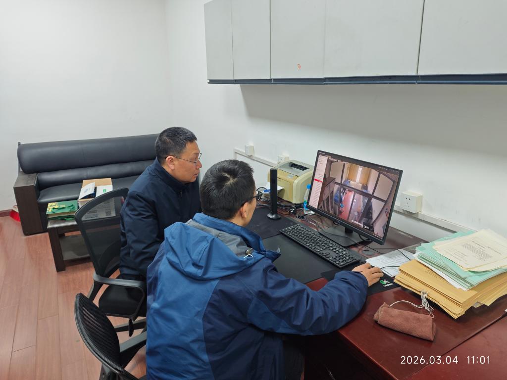 院长李良智、副院长周宇扬与实验中心主任顾华杰依托监控系统对全院实验室开展线上安全巡查。巡查发现部分实验室存在物品堆放杂乱、废旧纸箱堆积、废弃物未及时清理、学生实验未穿实验服等问题。检查组第一时间点对点通知相关实验室负责人落实整改,并通过新球