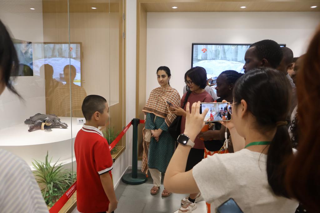 参观过程中,来自缅甸的留学生克丽丝全程用手机记录讲解内容,她表示,“以前只能在课本和网络上了解到中国的斑鳖、华南虎、中华鲟,今天才知道珍稀动物保护背后的故事——特别是像赵肯堂教授一样的科学家长期的坚持、政府的努力,甚至小朋友的参与。这让我明白,中国的生物多样性保护是全社会共同努力的结果”。