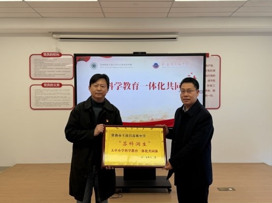 院长李良智为中学校长俞惠亭授予“苏科润生”科学教育共同体成员单位牌匾,新球