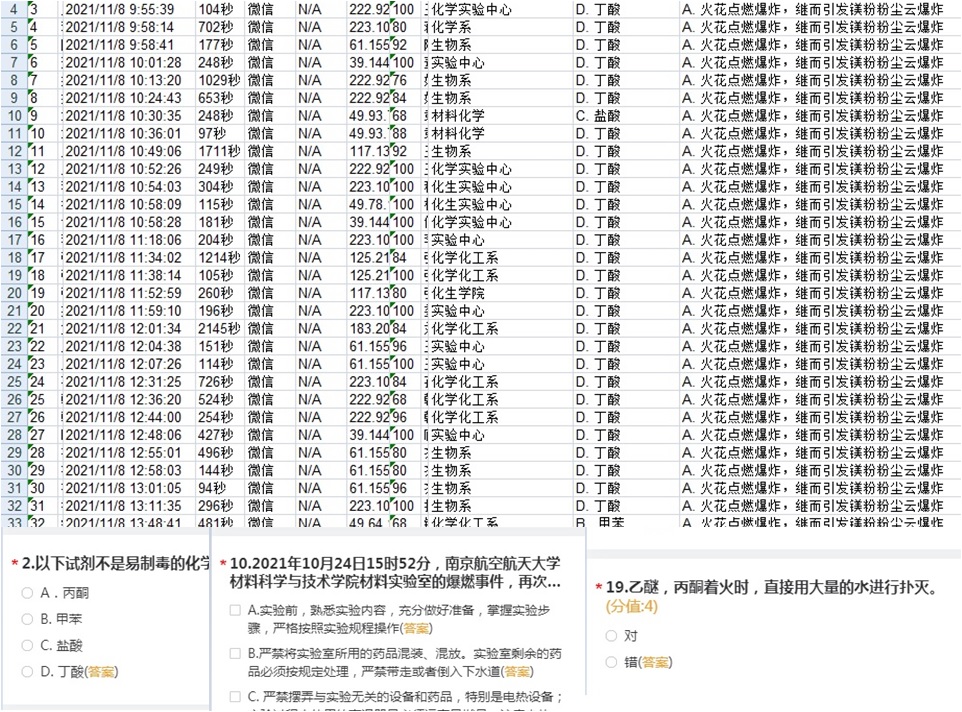 工会和实验中心合作,编辑了试剂安全管理方面的答卷,目的是能创造安全实验操作氛围。答卷内容主要包括易燃易爆易制毒试剂分类、试剂购买规定、试剂管理、废弃物处理等方面。答题时间是11月8日到10日。