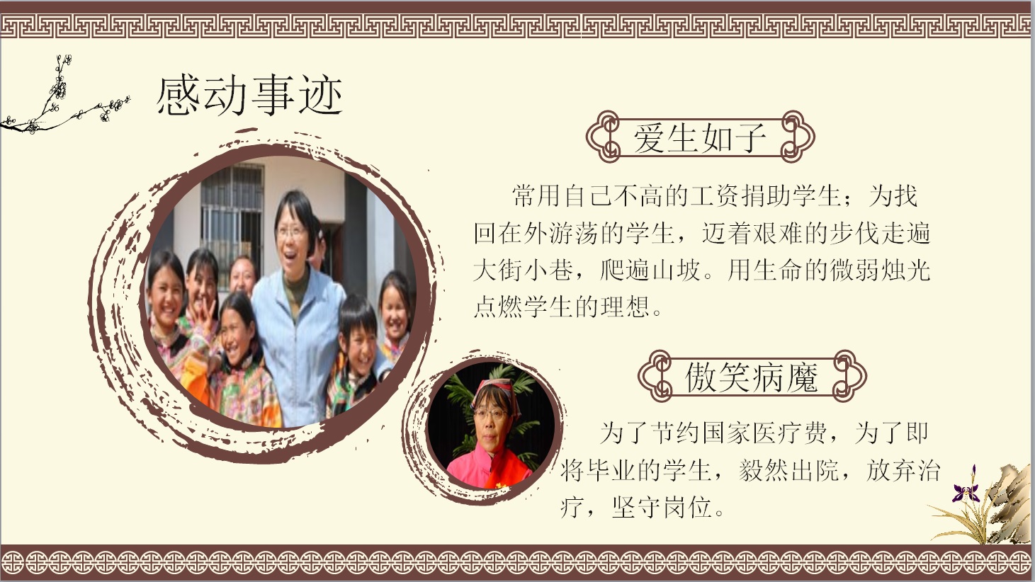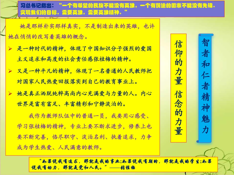 老师们被张桂梅同志不畏艰难、献身教育事业的事迹深深感动。她的事迹激励着大家不忘初心,无微不至地关爱学生;在我们平凡的岗位中恪尽职守,创造出不平凡的成绩,书写无悔的人生篇章。