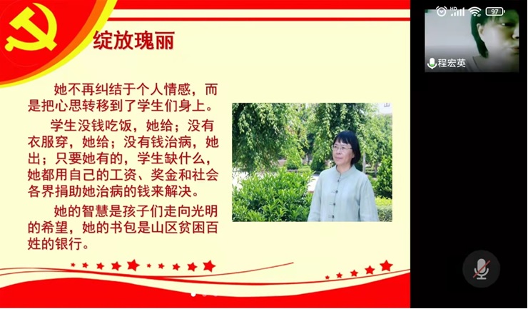 张桂梅同志是一名人民教师,是“时代楷模”,这是选此书的初心。会上每位老师分享了书中自己最感动的段落,采用了原文段落现场(录音)诵读、PPT展示、读书心得等分享形式。“她的智慧是孩子们走向光明的希望,她的书包是山区贫困百姓的银行”“善于总结,教育有方”“有信仰、大爱,彰显生命尊严”“有党员的坚定信念”“用生命做教育、执着”……,这些是大家的感动和敬佩之处。