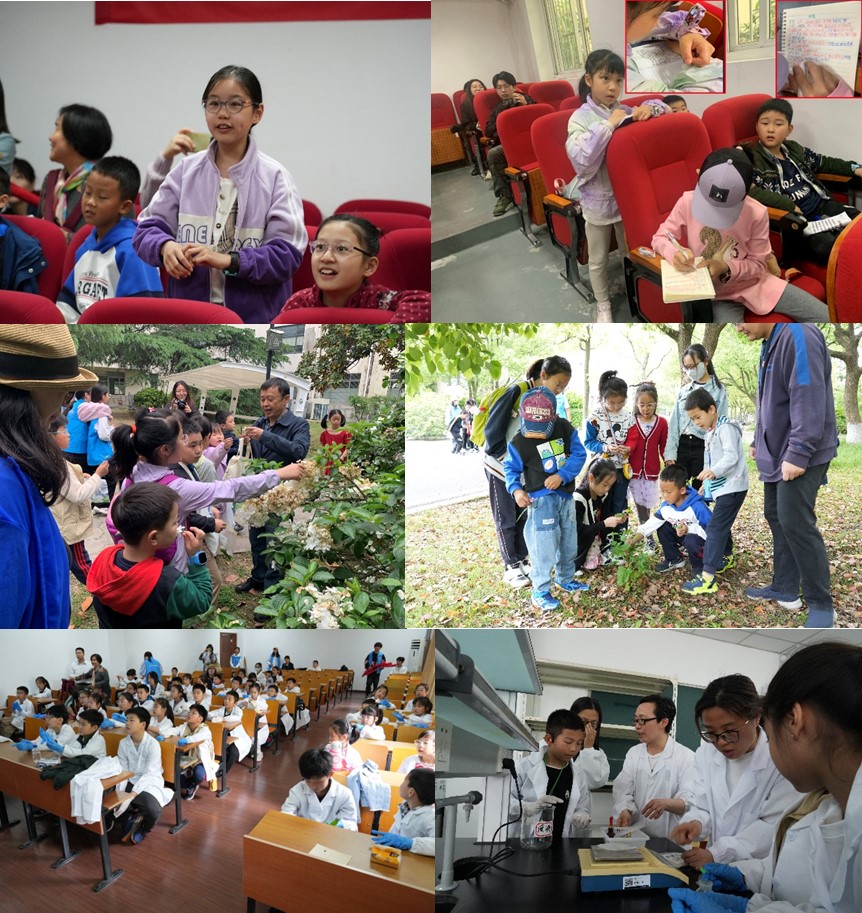本次活动共分四个环节:参观苏州市珍稀动物科普馆、听取科普讲座《野菜的故事》、认识校园植物和亲手实践“蓝晶雨”实验。首先,小朋友认真聆听并积极询问老师和志愿者关于斑鳖、扬子鳄、华南虎、中华鲟、圆鼻巨蜥、穿山甲等珍稀动物的现状和保护情况;在科普讲座环节,王金虎教授所作的报告引发小朋友们强烈兴趣,他们认真记录笔记,积极和王教授探讨各自食用过的野菜及野菜食用方法、注意事项等。在随后认识校园植物环节,小朋友们更是热情高涨,在鲜花盛开的校园里寻找本次科普讲座中提到的植物,认真观察了解相关植物的特征、生长情况等。在实验室,小朋友着迷于化学试剂产生的奇妙反应,在充分了解“蓝晶雨”实验的形成原理基础上,积极亲自实践,观察实验过程中的颜色变化,激发了强烈的科学探索精神。最终,小朋友们在“满载而归”的欢声笑语中圆满完成了全部活动。