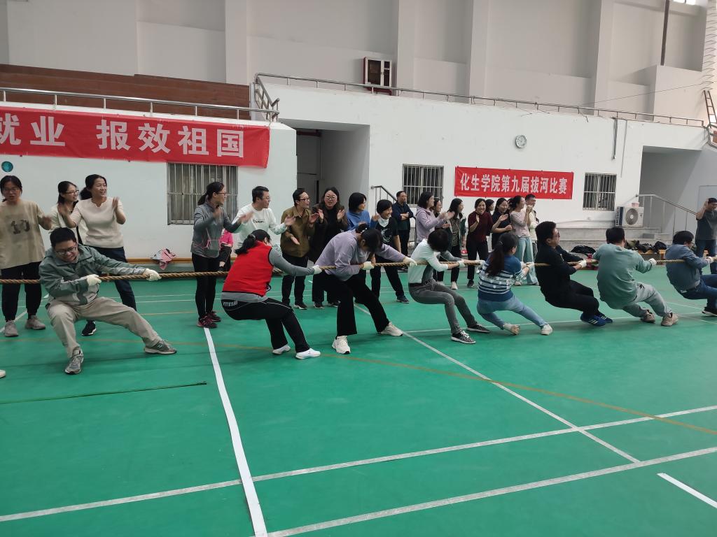 拔河比赛在“教工之家”秩序井然的进行。参赛队伍包括行政学工、实验中心、化学化工系、材料化学系、生物系,每支队伍参赛人员不超过10人。本次比赛采用小组淘汰赛的模式,其中化学化工系作为上届冠军直接进入第二轮比赛。赛场上参赛队伍做着精心排兵布阵,执行各种技巧,比如老师间顶着脚、身体下蹲、拉直绳子等,场上多次出现势均力敌的情况。加油声也此起彼伏地回荡在赛场上,每一场比赛都揪着心,期待着结果。最终,化学化工系成功卫冕。