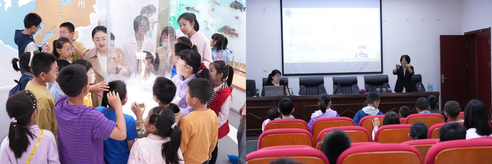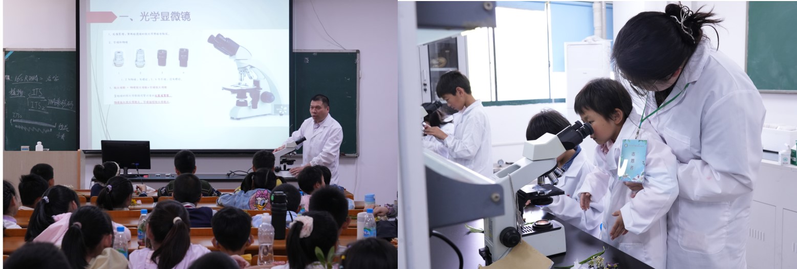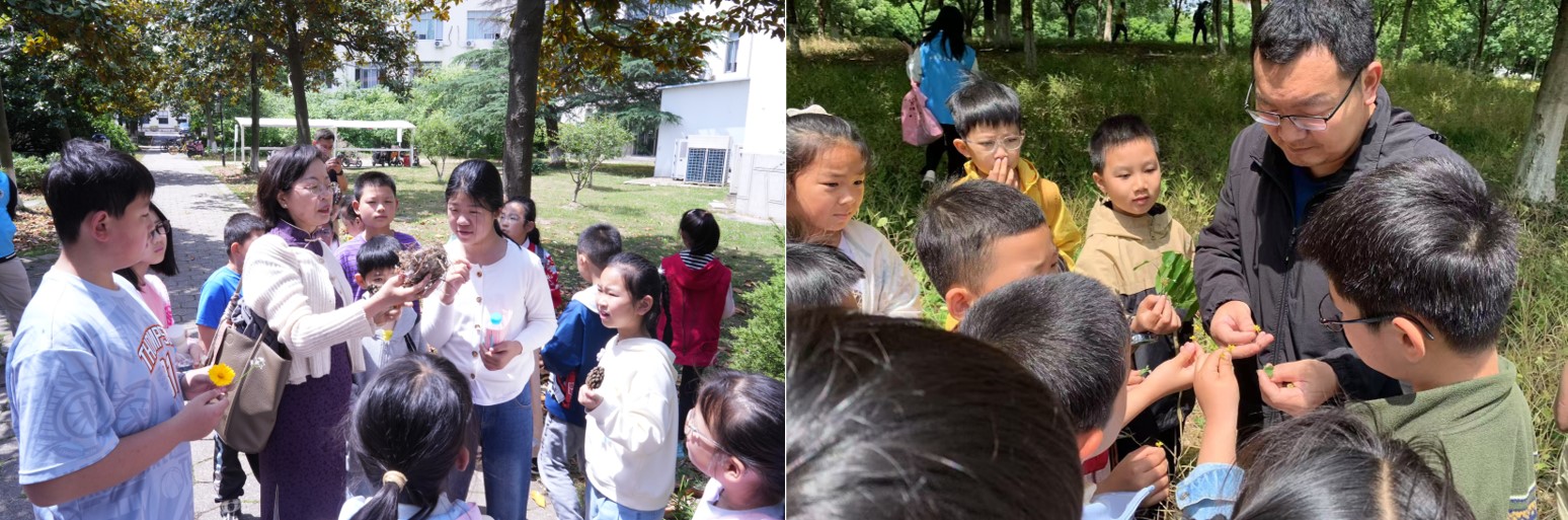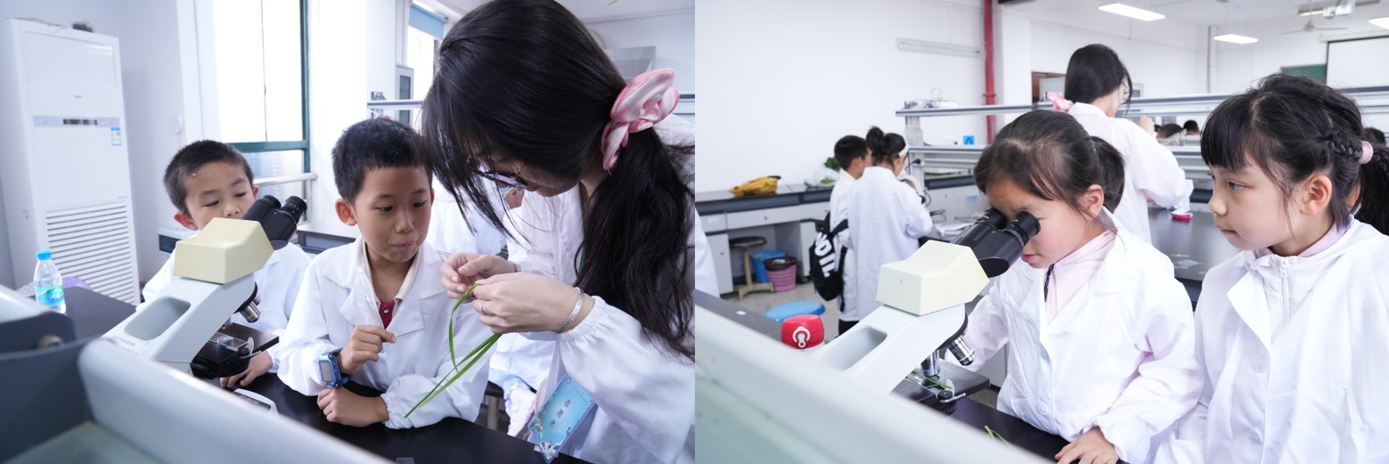 活动以"珍稀动物探秘"拉开序幕。在邵爱华老师和英晓莉老师的带领下,孩子们近距离观察斑鳖、中华鲟等濒危动物标本,通过互动问答了解珍稀物种保护现状。科普馆内此起彼伏的惊叹声中,生物多样性保护意识悄然扎根。随后的《食品化学大冒险》讲座现场,袁研老师和程宏英老师以"酸碱变色魔法"实验点燃全场。当紫甘蓝汁在不同溶液中幻化出彩虹色谱时,孩子们争先恐后与指导教师探讨日常食物的酸碱性奥秘。春意盎然的校园化身天然实验室,充满好奇心的"小小科学家"们穿梭于花丛间,在钱玮和邵爱华两位老师指导下对比不同花卉、植物的叶脉差异。芬芳的三角梅、挺拔的香樟都成了鲜活的教材,自然观察笔记上填满了童趣盎然的发现。两位老师更是向小朋友们讲解了校园内疯长的入侵植物,告诫他们植物入侵的巨大危害。显微镜观察环节将活动推向高潮。经过规范化培训后,孩子们独立完成显微观察,惊叹于韭菜表皮细胞的规整排列,好奇比较着不同花粉的独特形态。当孩子们主动要求延长观察时间时,在场的老师们欣喜地意识到:科学探索的种子已经在孩子们的心中萌芽生长。
