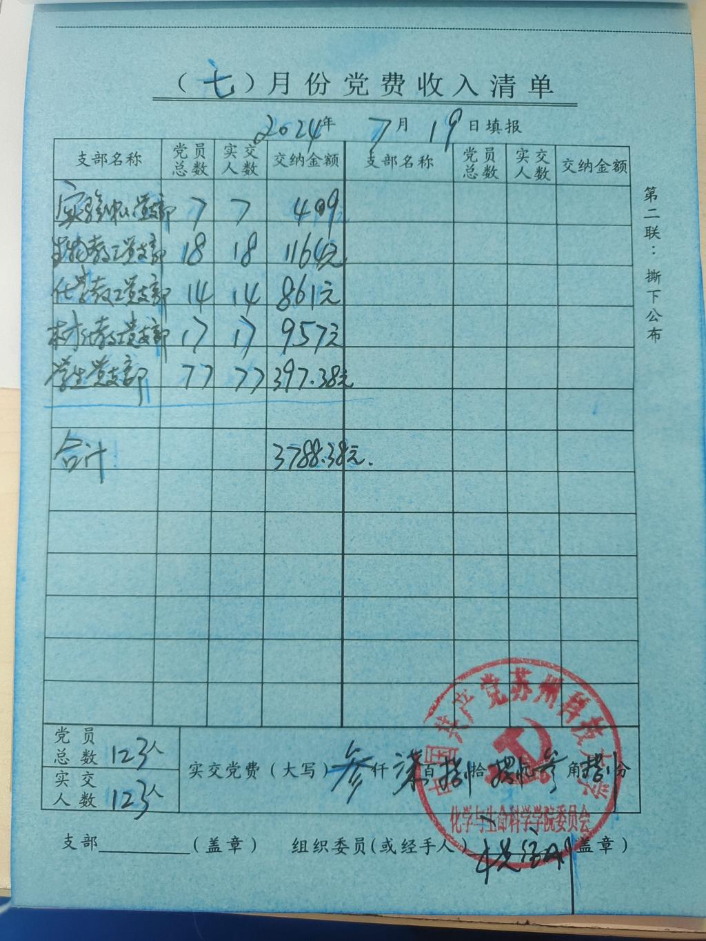 全院共收到实验中心党支部、化学化工系教工党支部、材料化学系教工党支部、生物系教工党支部和学生党支部123名党员交纳党费的3788.38元。