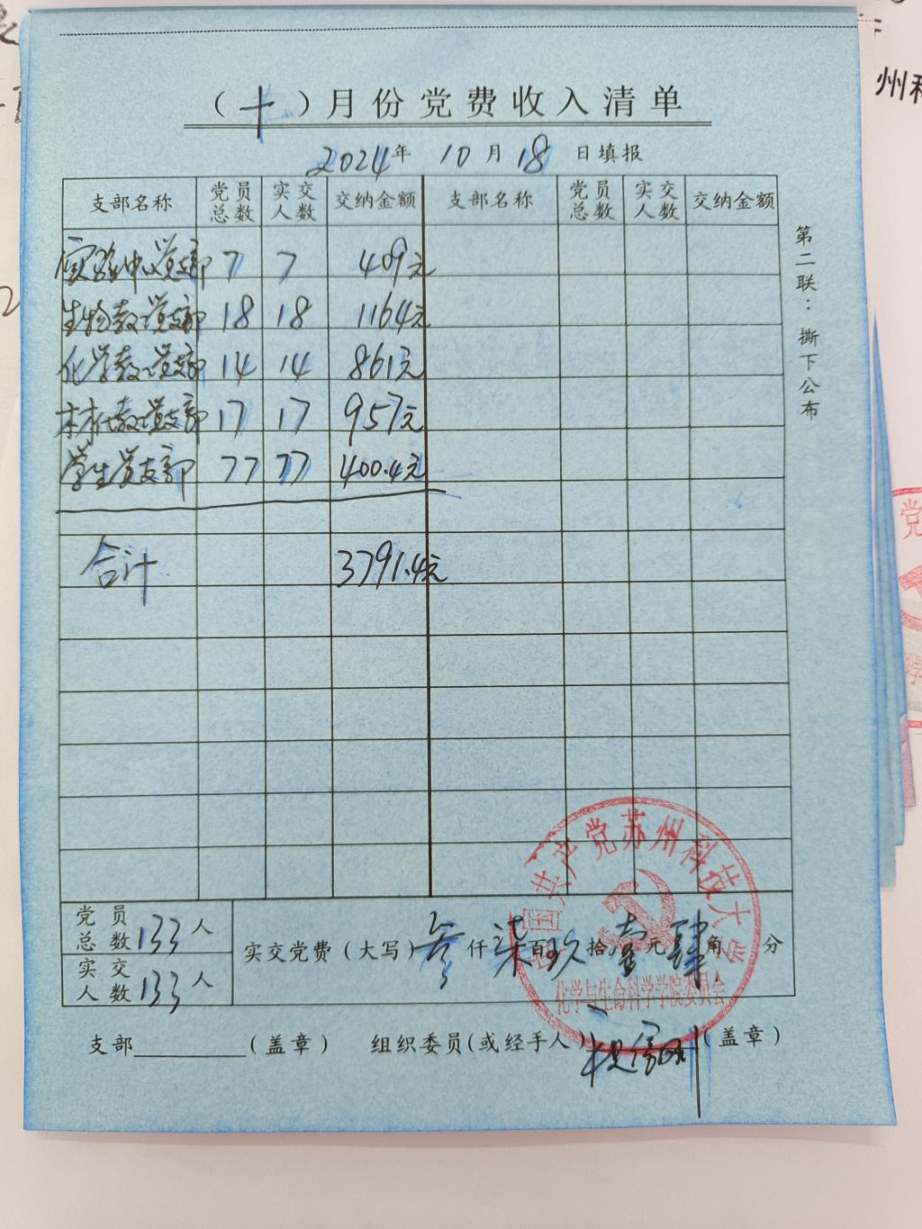 全院共收到实验中心党支部、化学化工系教工党支部、材料化学系教工党支部、生物系教工党支部和学生党支部133名党员交纳党费的3791.4元。