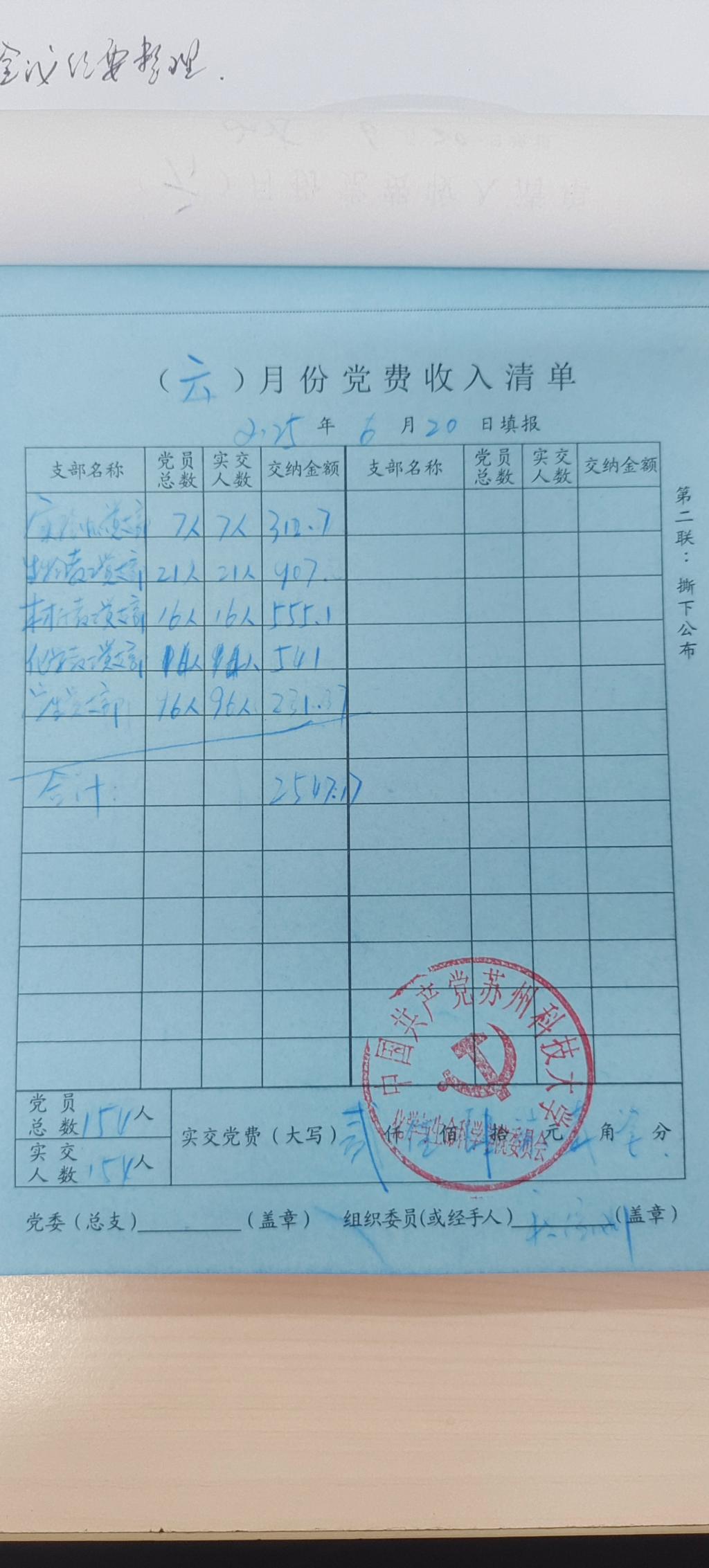 全院收到实验中心党支部、化学化工系教工党支部、材料化学系教工党支部、生物系教工党支部和学生党支部154名党员交纳的6月党费共计2547.17元。