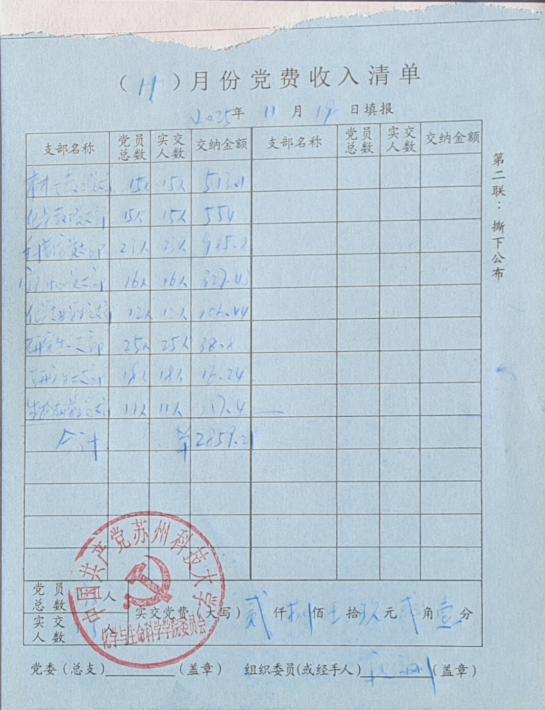 新球 收到材化教工党支部、化学化工教工党支部、科普馆党支部、实验中心党支部、学生党支部135名党员交纳的11月份党费共计2859.21元。