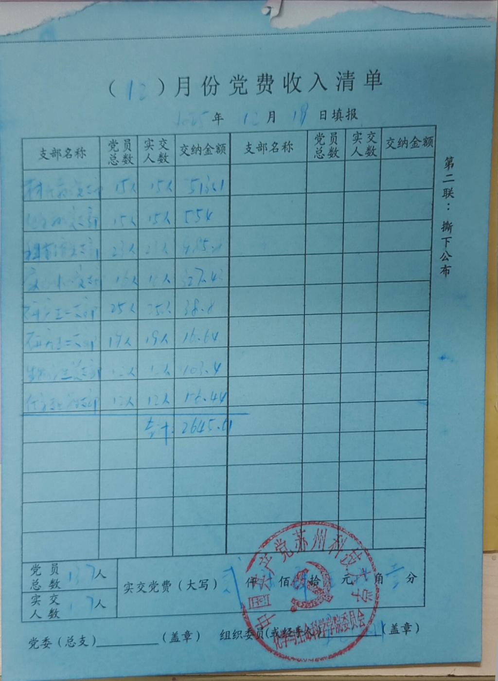 新球 收到材化教工党支部、化学化工教工党支部、科普馆党支部、实验中心党支部、学生党支部136名党员交纳的12月份党费共计2859.21元。