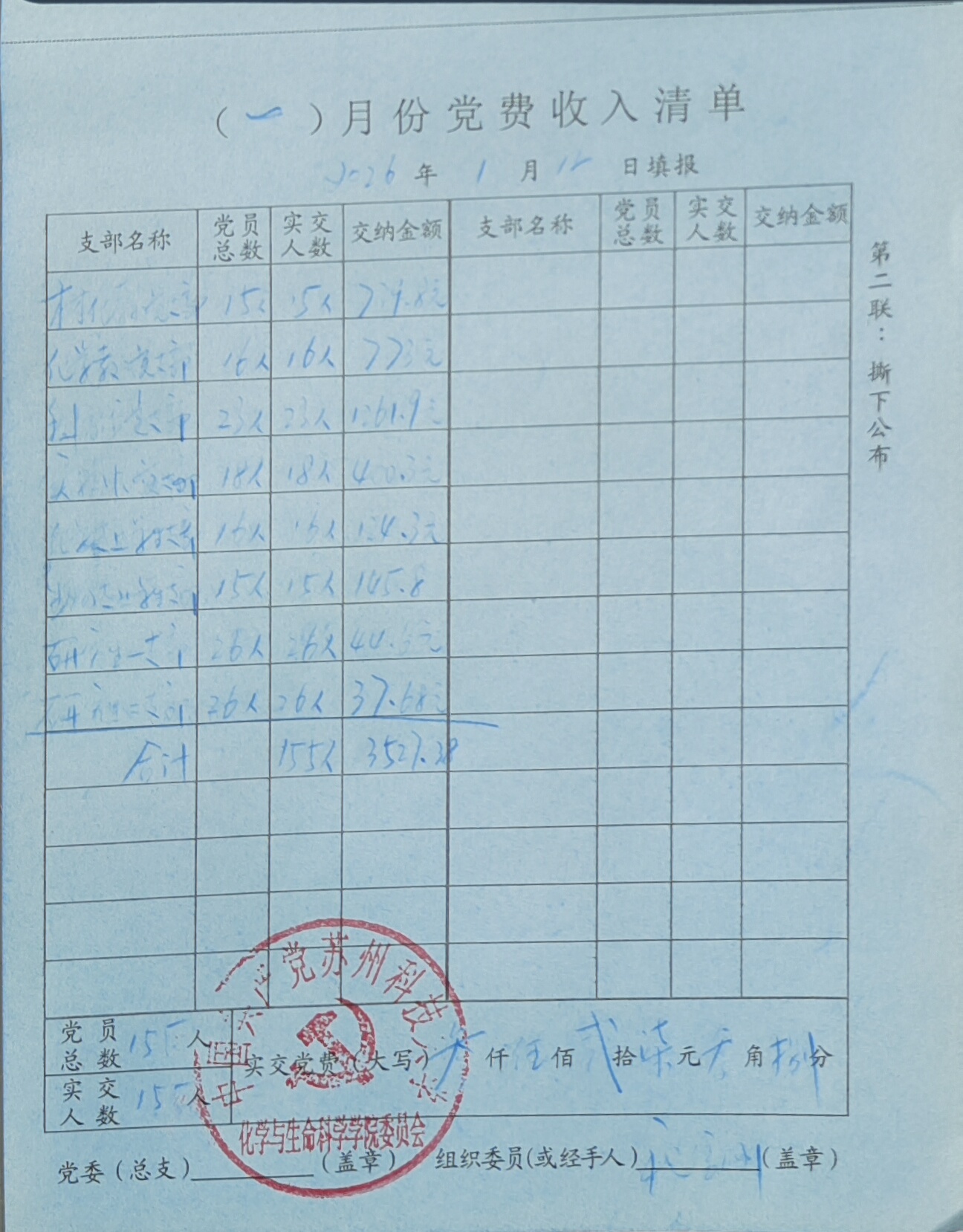 新球 收到材化教工党支部、化学化工教工党支部、科普馆党支部、实验中心党支部、学生党支部155名党员交纳的1月份党费共计3527.38元。