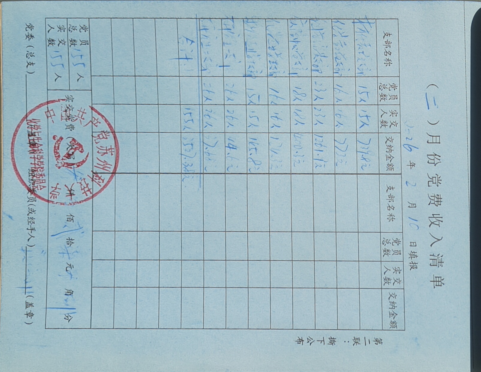 新球 收到材化教工党支部、化学化工教工党支部、科普馆党支部、实验中心党支部、学生党支部155名党员交纳的2月份党费共计3527.38元。