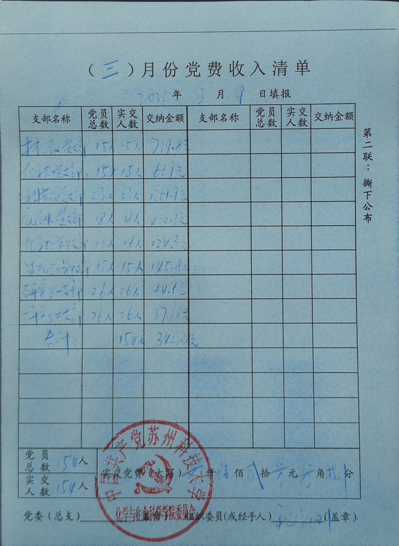 新球 收到材化教工党支部、化学化工教工党支部、科普馆党支部、实验中心党支部、学生党支部154名党员交纳的3月份党费共计3423.38元。