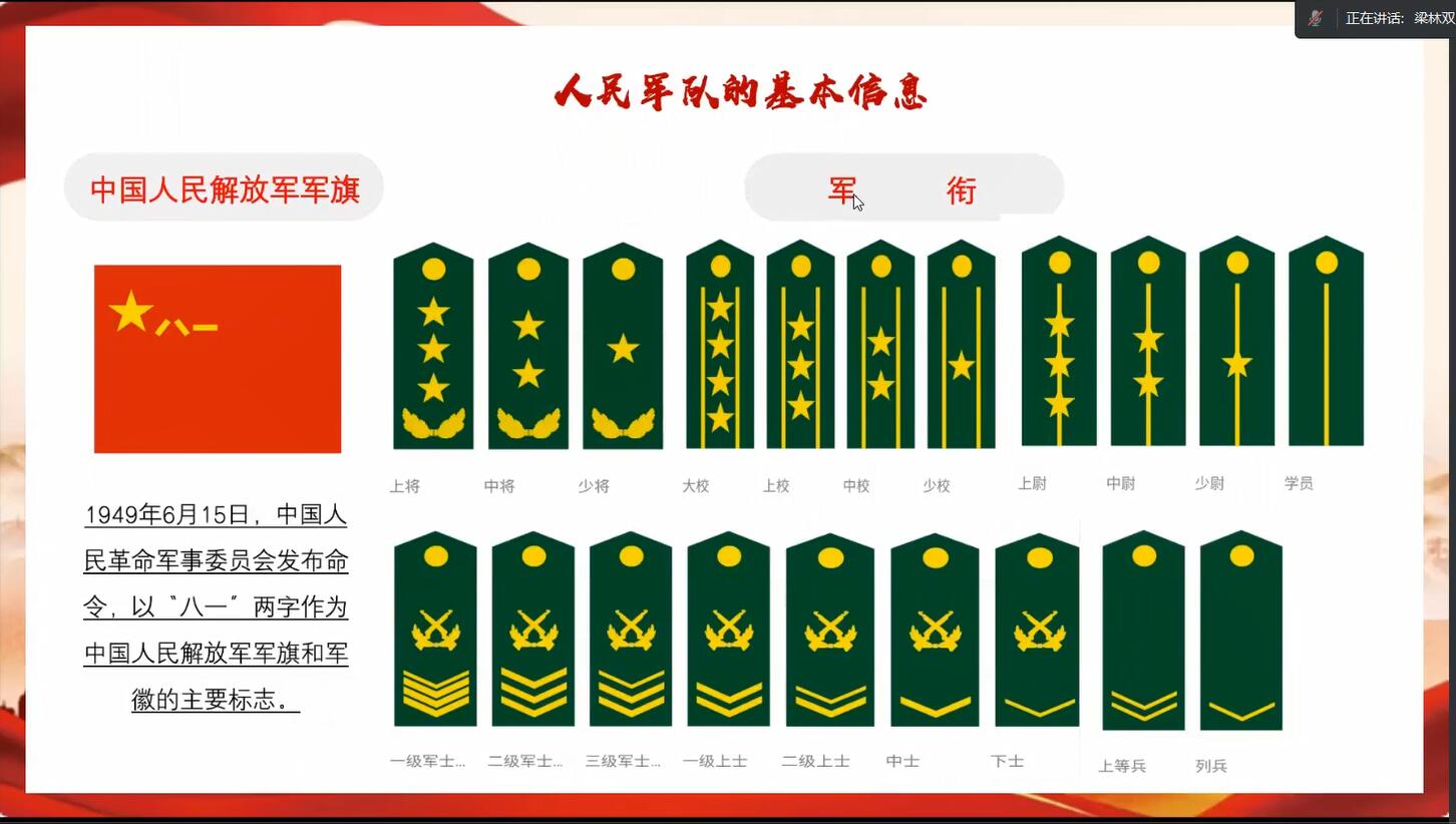然后,梁林双详细介绍了中国人民解放军军种、军区、军旗、军衔等内容,使得参加宣讲活动的同学们对中国人民解放军有了更加全面清晰的认识。