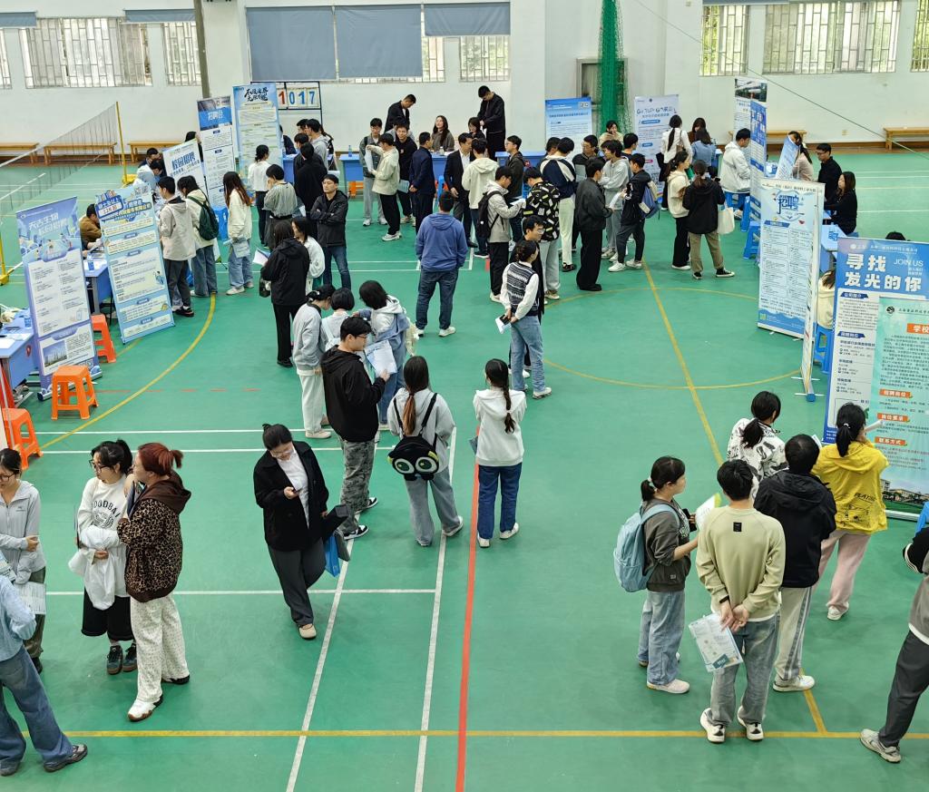 招聘会现场,毕业生与用人单位招聘人员就岗位要求、工作内容、福利待遇等开展深入交流。新球
