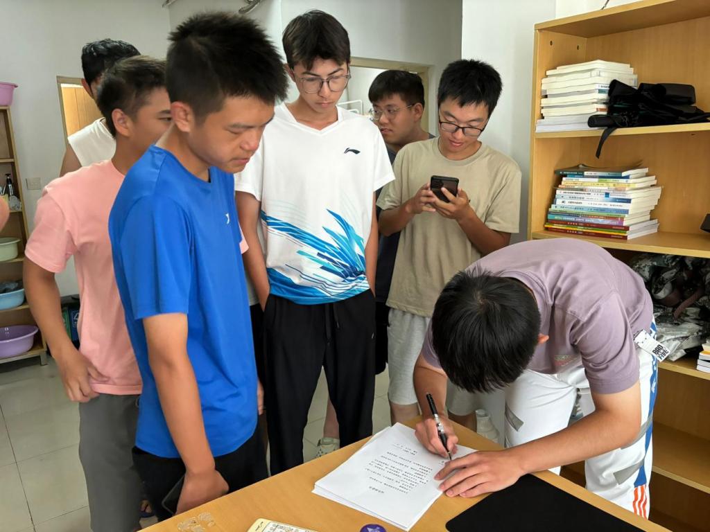 同学们郑重地在承诺书上签下自己的名字,表达了自觉抵制电信网络诈骗、维护自身及他人财产安全的决心,也体现了对校园纪律和安全规范的庄严承诺。