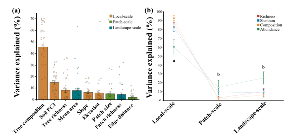 青年教师陆雅雯博士通过区域与全球尺度土壤采样研究,综合局域、斑块与景观尺度环境因子,揭示了土壤真菌多样性及群落组成的跨尺度驱动机制,为理解破碎化森林中土壤真菌多样性的形成机制提供了关键证据,并为景观尺度生态保护与生物多样性管理提供了重要科学依据。